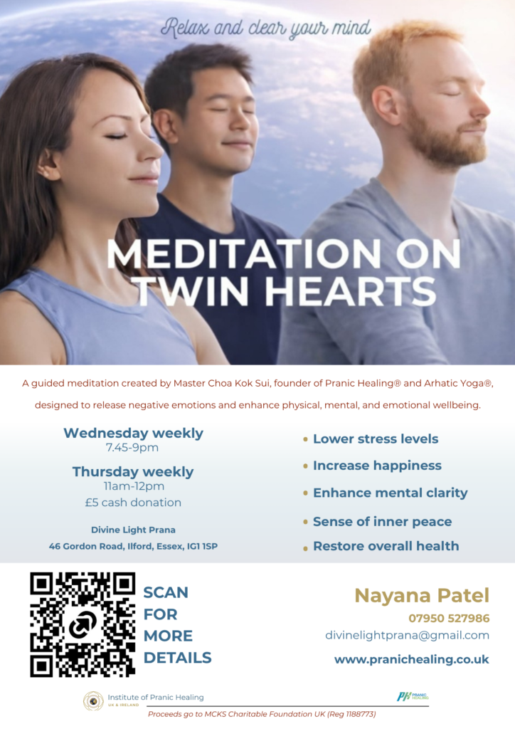 The meditation on Twin Hearts was created by Master Choa Kok Sui, modern founder of Pranic Healing & Arhatic Yoga, to help flush out negative thoughts and emotions our mind creates.